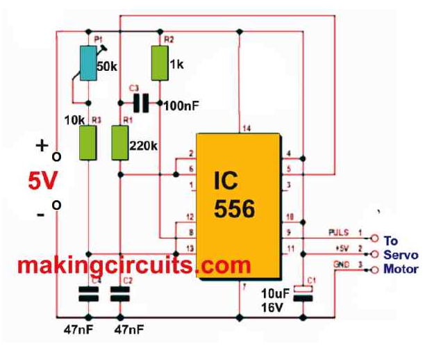 此外,導(dǎo)線上的信號經(jīng)過脈沖寬度調(diào)制(PWM)并由接收器傳輸。長度為1ms的正脈沖伺服臂從其行程的一端完全啟動。如果使用2毫秒的脈沖,則手臂完全朝相反方向移動。這些限制之間的脈沖寬度(PWM)將臂驅(qū)動到與脈沖寬度成比例的中間位置。1.5毫秒的脈沖寬度使手臂居中,脈沖重復(fù)率接近20毫秒或約50 Hz。然而,這并不重要。如果懷疑該型號工作不正常,則遙控發(fā)射器、接收器或伺服電機(jī)可能有問題。這是靈活的伺服電機(jī)測試儀電路允許您快速檢查伺服并從診斷步驟中刪除任何非因素。此外,圖1所示的脈沖發(fā)生器設(shè)計(jì)是電子愛好者最常見的類型。